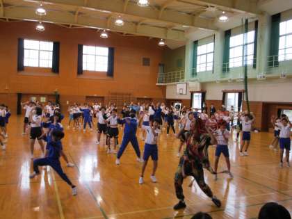世界的ダンサーとして活躍しておられるケント氏からダンス指導を受けました。初めは恥ずかしそうな様子でしたが、ケント氏の熱い語りかけや迫力あるダンスに促され、徐々に笑顔で大きく表現できるようになってきました。気持ちを体で表現する楽しさや、夢をもって生きる大切さを感じたようです。また、他校の友達のよさにも触れることができました。