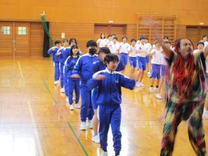 世界的ダンサーとして活躍しておられるケント氏からダンス指導を受けました。初めは恥ずかしそうな様子でしたが、ケント氏の熱い語りかけや迫力あるダンスに促され、徐々に笑顔で大きく表現できるようになってきました。気持ちを体で表現する楽しさや、夢をもって生きる大切さを感じたようです。また、他校の友達のよさにも触れることができました。