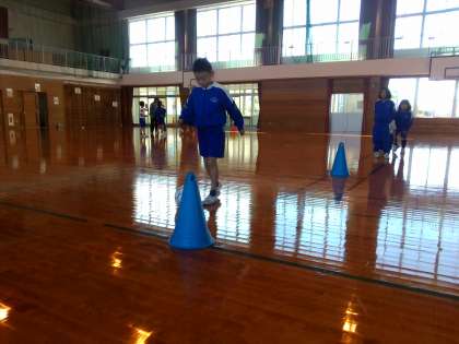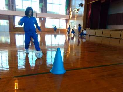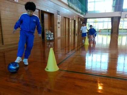 体育科「ボール蹴り遊び」では、サッカーボールを使ってパスをしたり、ドリブルをしたりしました。「(ボールが)まっすぐいかない」「難しいな」とサッカーの難しさを感じていました。