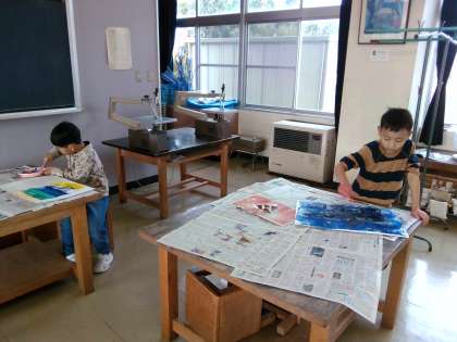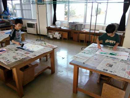 図画工作科「ぺったんコロコロ」では、トイレットペーパーやスポンジ、ローラー等を使って、色々な形を写すことを楽しみました。同じ形でも向きを変えると違った形が写ることに気づいていました。