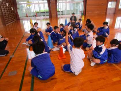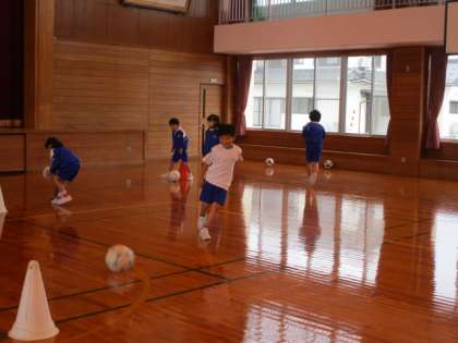ボールけりゲームをしています。まずは練習です。パス練習ばかりでなく、ドリブルの練習もしました。次にゲームをしました。振り返りでは、長いパスよりもドリブルをして、ゴール近くからパスをした方が当てやすかったという意見と長いパスで遠くからそのまま蹴る方がいいという意見と出ました。どちらもその時によって使い分けるといいことを学んでいました。
