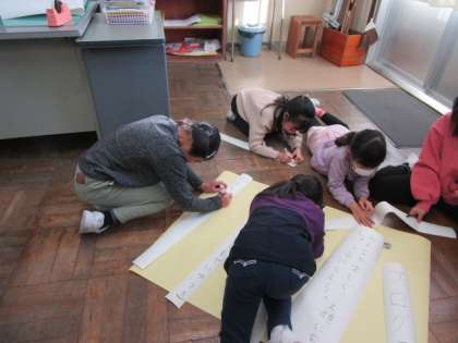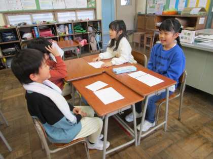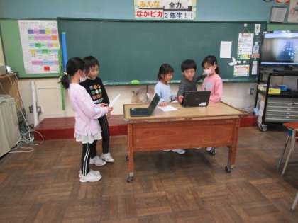 2年生の20日のロング時間の全校集会の準備をしています。「全校のみんなで楽しもう集会」と名前も決めました。お知らせの紙チーム、司会・始め・終わりの言葉チーム、放送・お知らせ配りチーム、プログラム作りチームです。お知らせの紙チームは終わって、プログラムチームのお手伝いをしました。どのチームも仲良く活動していました。どんな活動も仲良く進めることができるすてきな子供たちです。