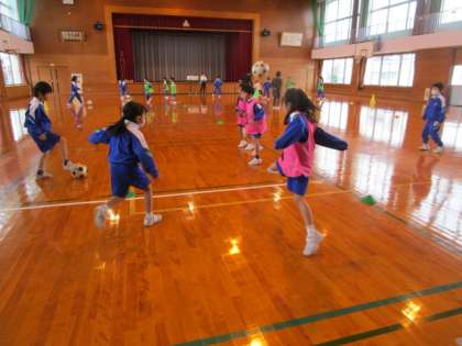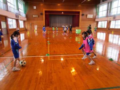 ボールけりゲームをしました。今日は、ボールけりゲームの終わりです。最後にみんなで試合をしました。どのチームも得点を入れることができました。守りも上手になりました。足でボールをコントロールする力が付きました。