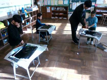 図画工作科の学習では、版画を作製しています。今日は色をつけた画用紙の上に好きな形のシールを貼り、さらに黒色のインクで塗りつぶしました。