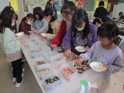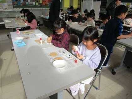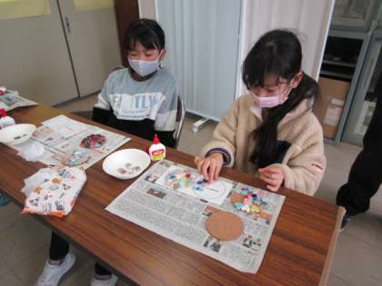 ものつくり教室がありました。まずは、タイルの付け方を実演してもらいました。タイルのでき方が分かりました。その後、自分の選んだフォトスタンドかコースター作りに取り組みました。どの作品もその子らしいとてもすてきな作品になっていました。