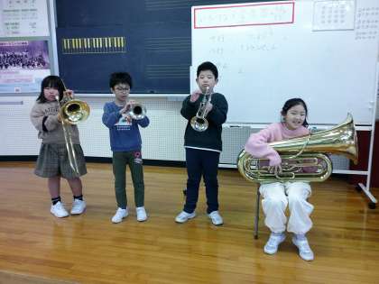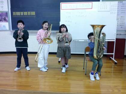 音楽科の時間に、トランペットやトロンボーンに触れてみました。楽器を吹くまねをして楽しみました。