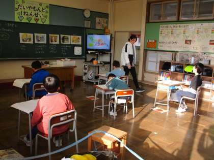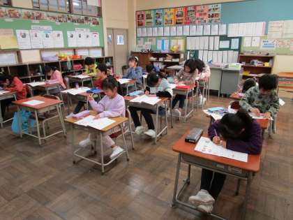 1年生の国語の学習では、「たぬきの糸車」の好きな場面を決め、想像して絵に表していました。2年生の書写の学習では、文字の中心を意識して、どの子も整った文字を書いていました。