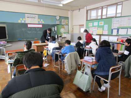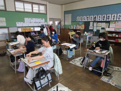 6年生は、英語のヒアリングテストをしていました。4年生は、書写の学習で、文字の大きさのバランスに着目して練習をしていました。
