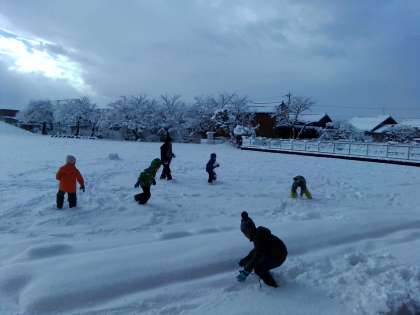 生活科「ゆきやこおりであそぼう」では、雪や氷を使った遊びを考え、雪遊びを楽しみました。グラウンドの雪山からそりで滑ったり、雪だるまを作ったりしていました。