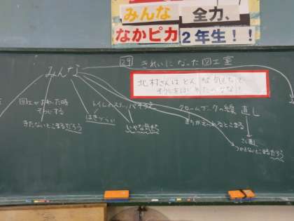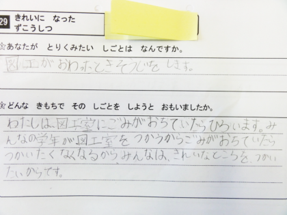 2年生では、みんなが使う場所をきれいに整備するよさについて考えました。自分なら、どのような場所を、どのように整備するかにを考え、自分も他者も気持ちよく過ごすことができることに気付いていました。