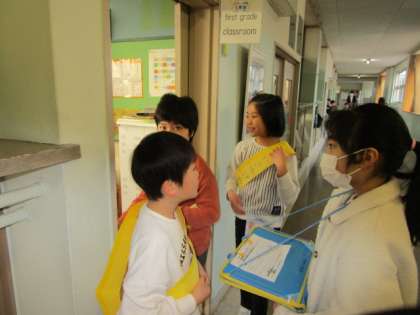 2年生の臨時企画委員会のチームは、あいさつ運動とお昼に放送をしました。「あいさつを自分からするのは、ドキドキする」「だれがいいかな」とつぶやいていました。かわいさを振りまきながら、しっかりとあいさつ運動をして回ることができました。