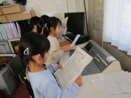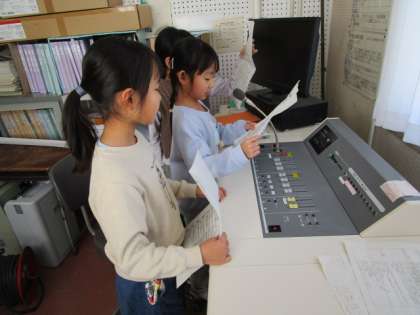 健康委員会チームは給食の献立放送をしました。12時25分になって職員室横の放送室へ行きました。放送原稿は、昨日、保健室の先生から、もらって練習していました。今日は、交代もスムーズにできてとても聞きやすくできました。「明日もお願いします」と言われてとてもうれしそうな2年生の子供たちでした。