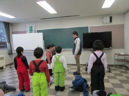 国立立山青少年自然の家で冬の体験学習を行いました。館内オリエンテーリングと木の葉のしおりづくりをしました。