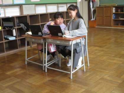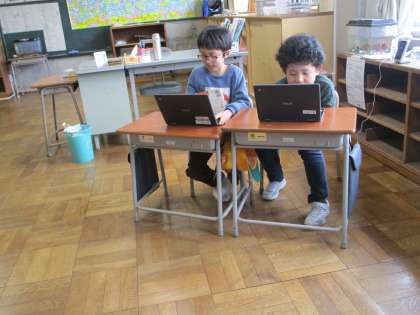 国語科では、「学校のじまん」を見付け、クロームブックにまとめています。それぞれペアで話し合って、協力しています。