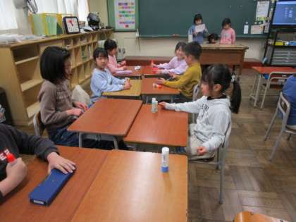 2年生のおもしろ係が双眼鏡作りを計画し、学級のみんなで作りました。学級の子供たちはできあがった手作りの双眼鏡を覗き、楽しんでいました。