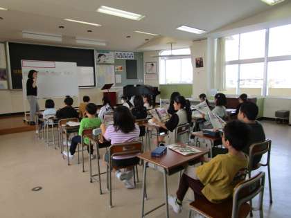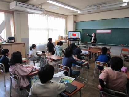 3・4年生は、音楽室で、音楽専科の先生と合同で音楽の学習をしていました。教室では、5年生が教頭先生と社会の学習をしていました。