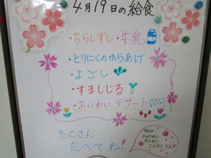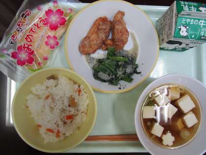 入学お祝い献立です。すまし汁にサクラの形の豆腐が入っており、子供たちに、笑顔が見られました。