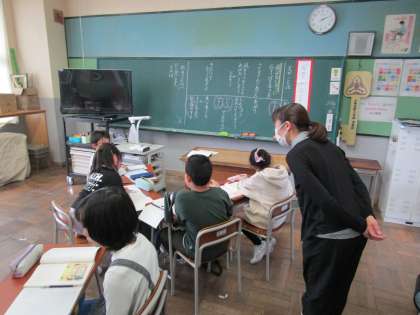国語の学習中です。4年生は「白いぼうし」、5年生は「銀色の裏地」、どちらも物語文の読み取りをしていました。