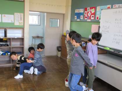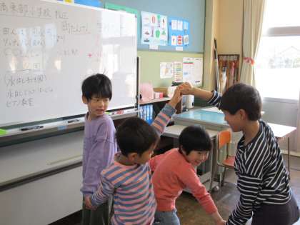ランドセルを片付けた後、なかよく遊んでいました。笑顔いっぱい、とても楽しそうです。
