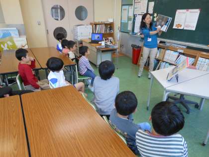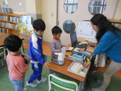 図書室の使い方についてのオリエンテーションを行いました。司書の方から本の貸し出しの仕方や本の扱い方について教えていただきました。また、「どうぶつのしっぽ」の本を読み聞かせてくださいました。後半には、本を選んで借りたり読んだりしました。