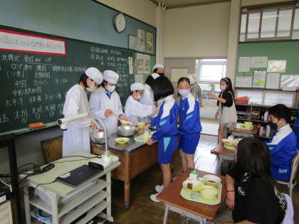 1・2年、3年、4・5年教室の給食準備の様子です。給食当番の子供たちも、待つ子供たちも、静かに、落ち着いて準備をしています。