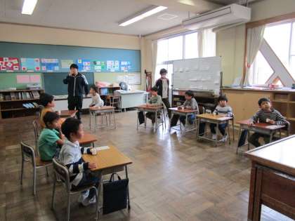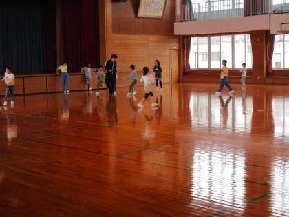 水曜日の給食後は、MTタイムです。掃除なしでたっぷり遊んでいます。今日の天気は雨。子供たちは、ALT(外国語指導助手)の先生や教員と、体育館で体を動かして遊んでいました。