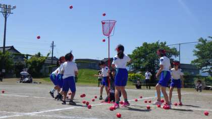 玉入れの様子です。1・2年生、4・5年生の合計数で競いました。どちらの団も学年も、ねらいを定めて協力して頑張りました。