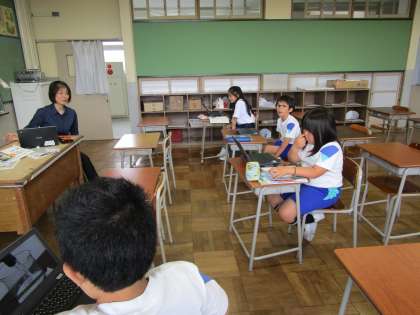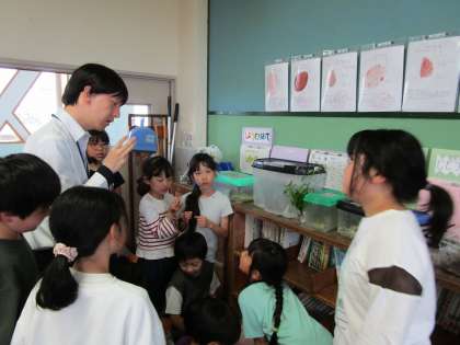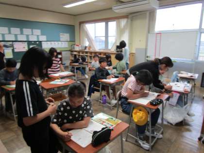 3年生は、モンシロチョウに砂糖水をあげて、観察していました。4年生は、一人一人が動画を見ながら、水がきれいになる仕組みについて気付いたことを書き出していました。4・5年生は、教え合いながら算数の問題を考えていました。