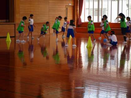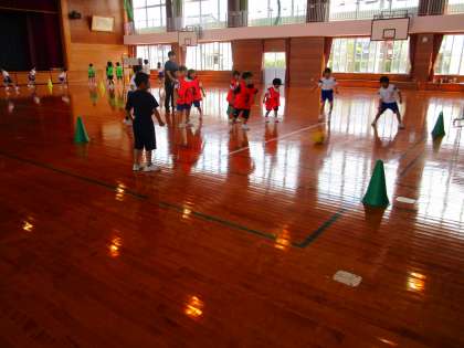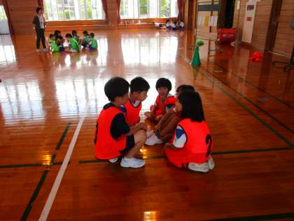 体育科の学習で、転がしドッジボールをしています。グループごとに作戦を相談し、試合で試していました。作戦は成功したかな。