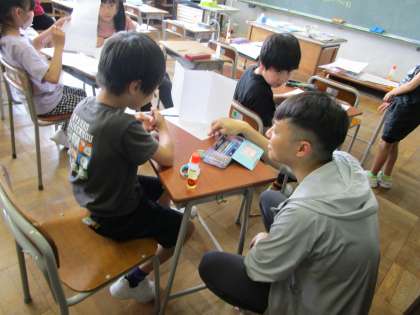 3年生以上の学年で図画工作科の学習がありました。今日は、イマージョンALTの来校日です。3・4年生は、「これは、英語でなんと言うの?」と質問し、会話しながら作品を作っていました。5年生は、ALTに補助してもらいながら、電動糸鋸に糸鋸刃を付ける練習をしていました。