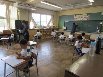 1年生は、国語の学習でノートに丁寧にひらがなを書いていました。2年生は、国語のテストに真剣に取り組んでいました。