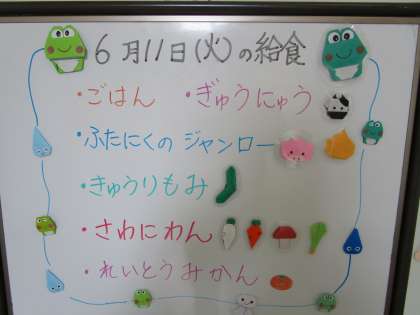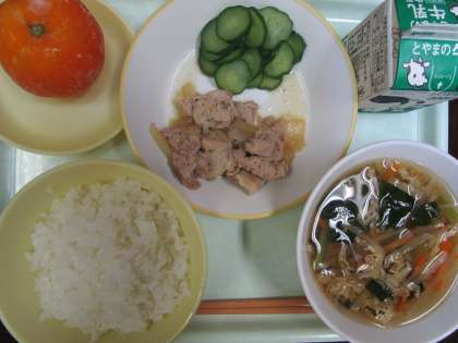 今日の給食です。朝のプール清掃後の冷凍ミカンは、特別おいしかったようです。