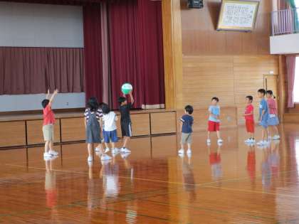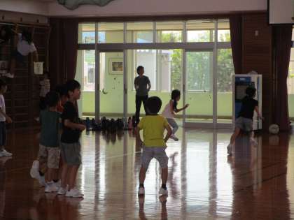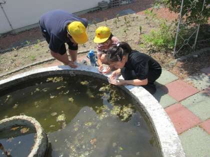 暑い日となりました。子供たちは、水分補給と涼しい教室での休憩をしながら、いつもより長いMTっ子タイムを楽しく過ごしました。MTガーデンの池でメダカの卵をすくう子供たち、体育館で元気に遊ぶ子供たちの様子です。