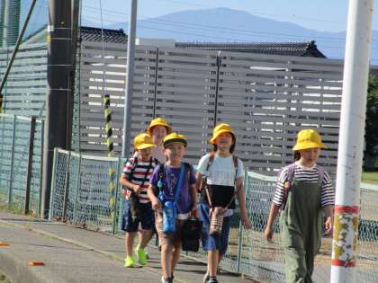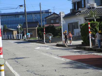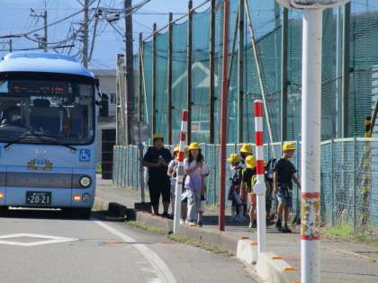 昨日は、雨が降っていましたが、今朝は、とてもよい天気です。子供たちは、笑顔で気持ちのよい挨拶をしています。強い日差しを避けるため、日傘を差して登校する子供たちも見られます。コミュニティバスを降りた子供たちは、バスを降りると並んでから歩道を歩いてきます。
