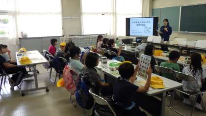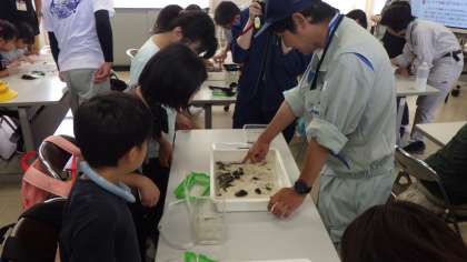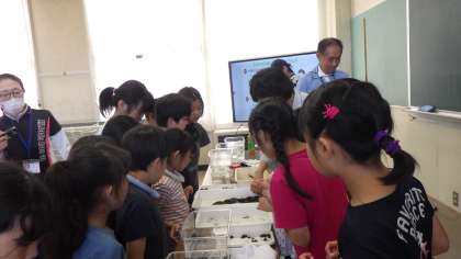 帰校後は、水橋農地整備事業所の方々を中心に、田んぼの役割や田んぼが生きものの住みかになっていことを説明していただきました。また、自分たちが捕まえてきた生きものについて、説明していただいたり、事前に捕ってきた生きものを観察したりしました。