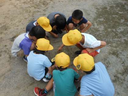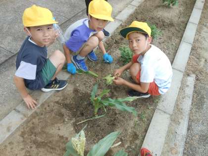 トウモロコシがすくすく伸びて、実もできてきました。しかし、横の実に虫が入っていることを発見しました。そこで、横の実を取ろうとしたところ、茎も折れてしまいました。茎も虫が入っていて弱くなっていたのでしょうか。残念です。でも、横の実をむいていくと中からかわいらしいコーンが出てきました。ヤングコーンのようです。みんなでどうするか相談しました。