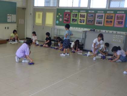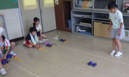 理科の学習では、ゴムの力を使って車を走らせる学習をしています。ゴムを長く伸ばすほど、物を動かす働きは大きくなることに気付きました。