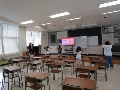 音楽室では、子供たちがダンスの練習をしています。ダンスの好きな子供たちが教員と一緒に元気いっぱい踊っています。
