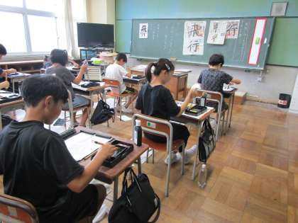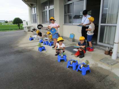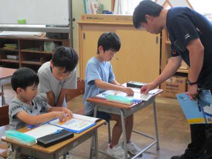 1・2年生は、算数科の学習です。算数ブロックを使って1年生が説明し、2年生が聞いてあげていました。3年生は、理科の学習です。育てているホウセンカを観察し、カードに記録していました。5年生は、書写の学習です。書き順に気を付けて書いていました。