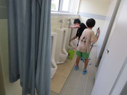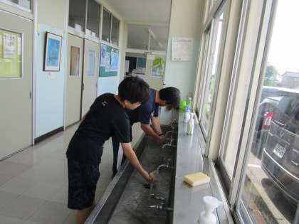 教職員と一緒に、トイレや洗面所等を丁寧に掃除しています。