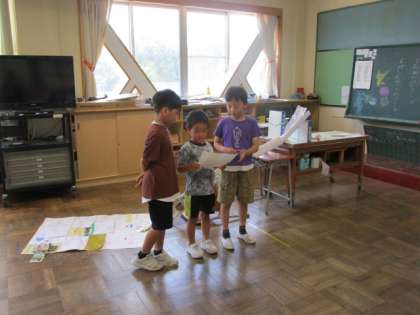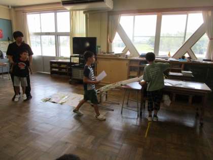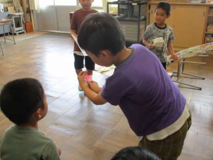 あそび係は、手裏剣をゴムの力で飛ばして、的当てゲームを紹介しました。