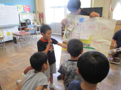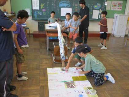 工作係は、作ったトンネルで、玉転がしを紹介しました。楽しい得点のシートも作りました。