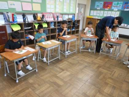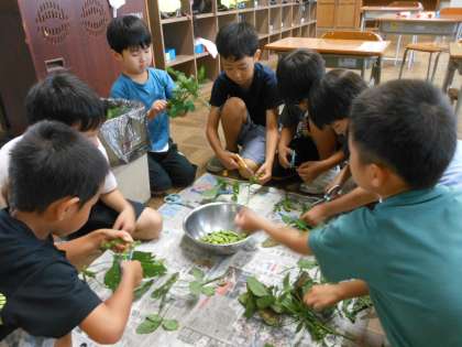 終業式のあと、1・2年生が育てていた枝豆が実ったので、収穫しました。みんなで枝からさやを切り離し、茹でました。「あまい!」と、うれしそうな声が聞かれました。みんなでおいしくいただきました。