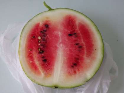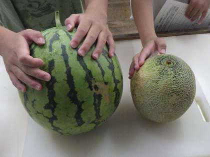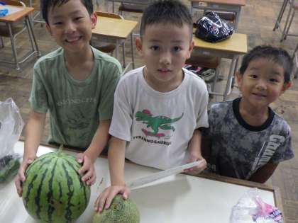 スイカとメロンが大きく育ったので、収穫しました。1学期の話合いで、世話を担当していた人が順番に持って行くことに決まりました。そこで、プールへ入りに来た帰りに、収穫しました。スイカは世話担当2名で分けます。切り口を見ると、おいしそうです。メロンの実り具合は、切ってからのお楽しみです。