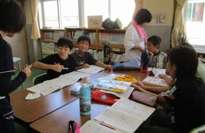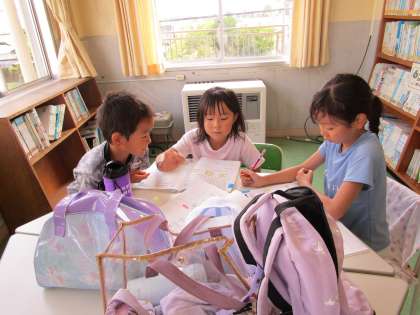 多くの子供たちが図書室を利用しています。静かに本を読んだり、友達と一緒に勉強したりして、プール後の時間を過ごしています。