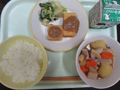 今日の給食です。本校のご飯は、市内でも珍しく自校炊飯であり、ほかほかでとてもおいしいです。大きい揚げ出し豆腐は3年生以上、小さい方は、1・2年生用です。