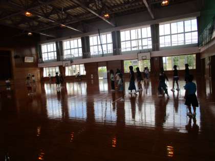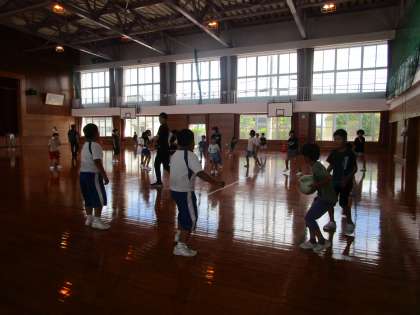 体育館では、ビーチボールやドッジボールで遊んでいます。水筒を体育館に持ってきて、いつでも水分補給ができるようにしています。