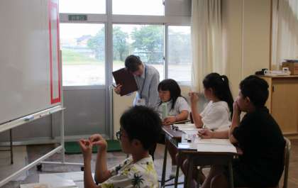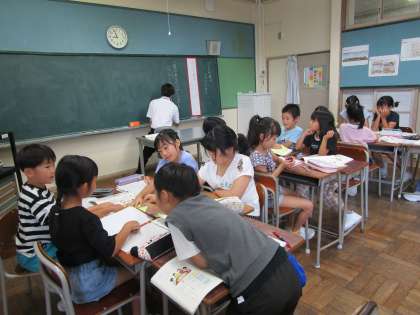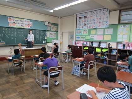 上と中の写真は、3・4年生の国語の学習の様子です。下の写真は、1・2年生の書写の学習の様子です。
