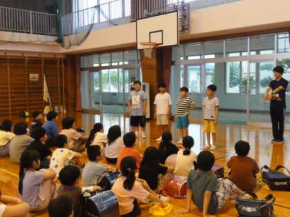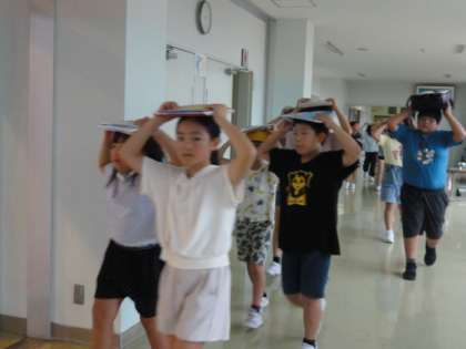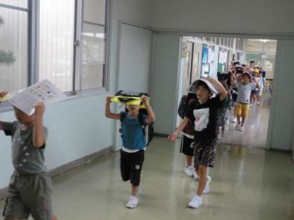 9月1日がシェイクアウト富山防災の日であることをうけて、地震を想定した避難訓練を実施しました。揺れた時や揺れた後、落下物から身体を守るため、頭部を守りながら避難することも訓練として行いました。身体を守るための行動について学び、日頃から真剣に取り組む大切さを感じていました。