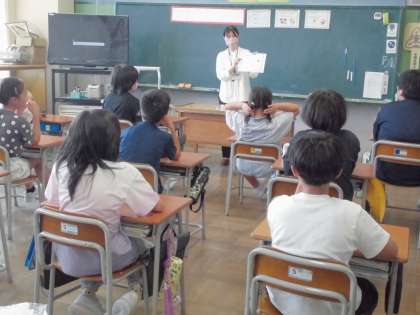 栄養士の先生から、朝食の大切さを教わりました。朝食を摂ると、頭、体、腸のスイッチが入って元気に生活できることを学び、自分の生活を振り返っていました。
